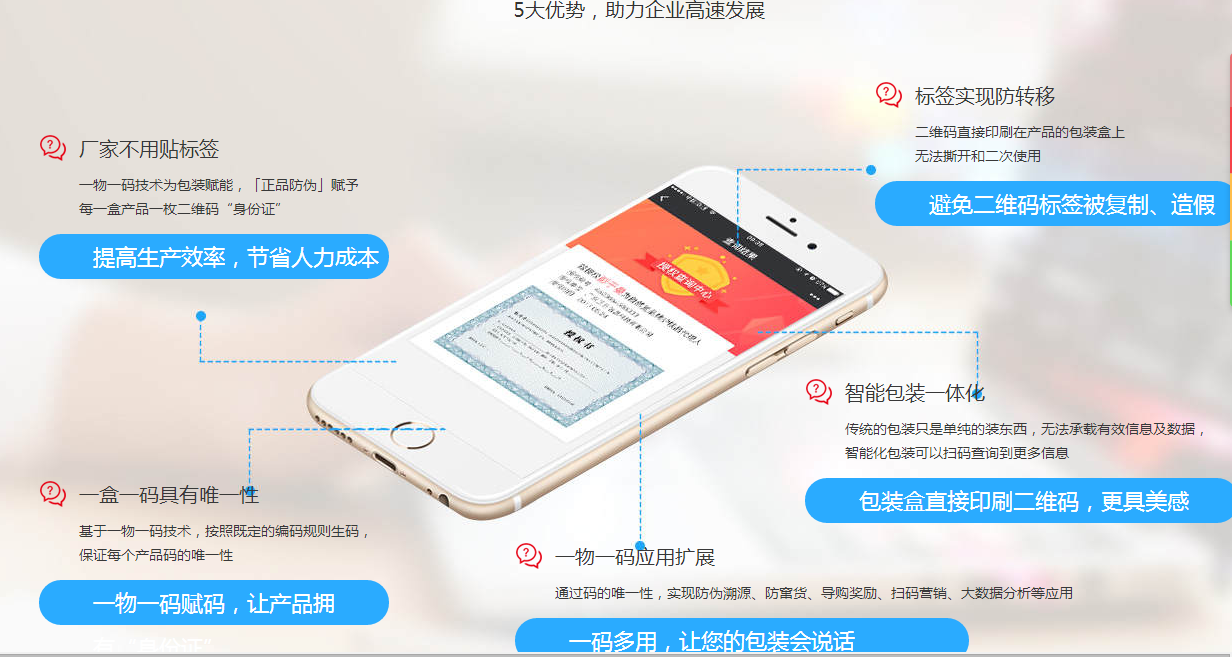 正品智能包裝公司推出防偽包裝盒通過賦予包裝盒一個二維碼標簽,以二維碼為信息載體,不僅實現了產品終極防偽,這個二維碼還存有產品非常詳細的信息,包括名稱、成分、產地、保質期等信息,還為消費者提供完整的企業基本信息、品牌故事、企業產品分類及介紹、最新促銷活動等資訊,有效實現產品的宣傳促銷及品牌推廣。